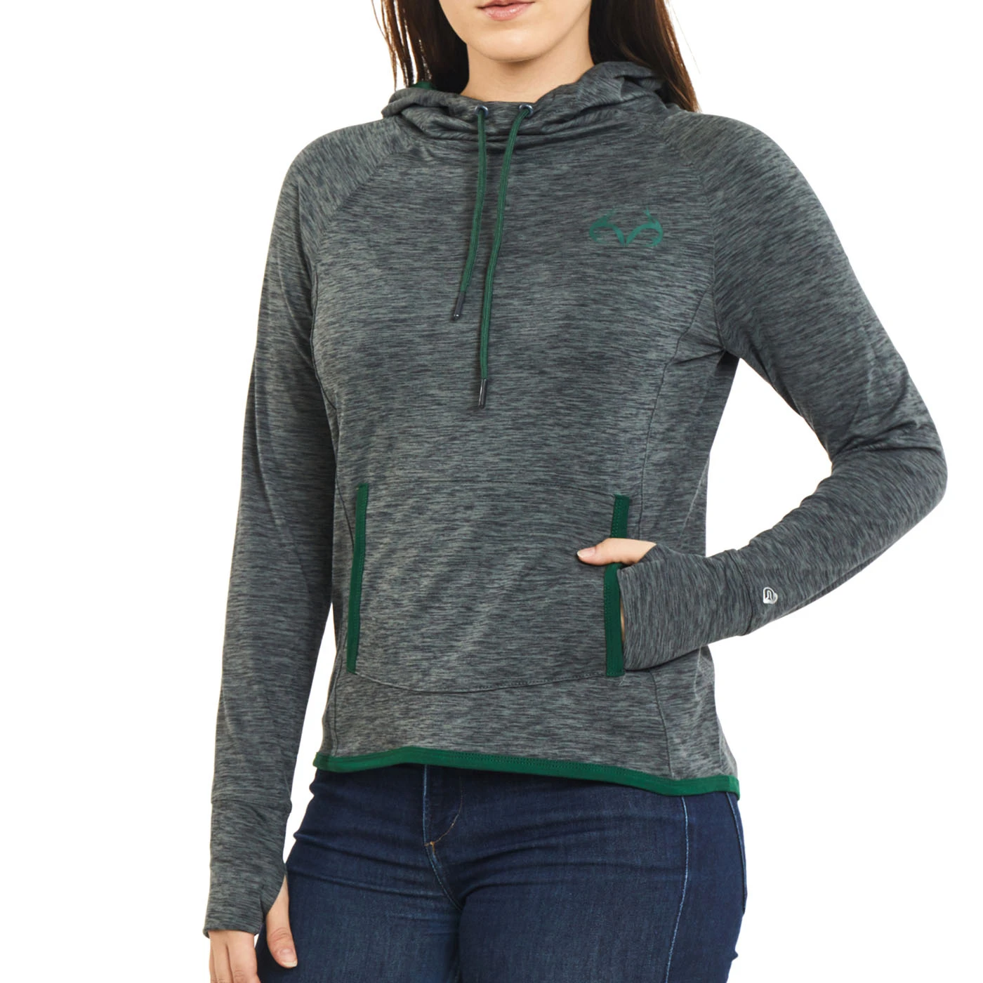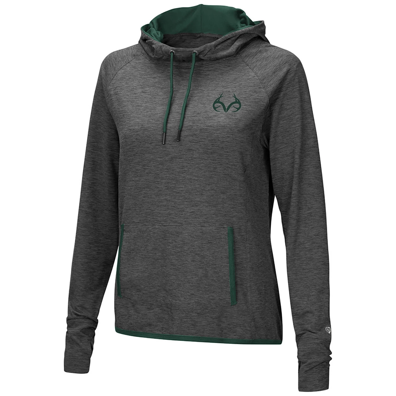 The Realtree Women’s Corkscrew Cowl Neck Hoodie is the perfect blend of style and performance for your active lifestyle. This hoodie features a heathered charcoal body that exudes a trendy and versatile look. The iconic antler logo in green on the left chest adds a touch of authenticity and outdoor charm, while the bold “Hunter” wordmark in green with a yellow outline vertically on the back showcases your passion for the hunt.